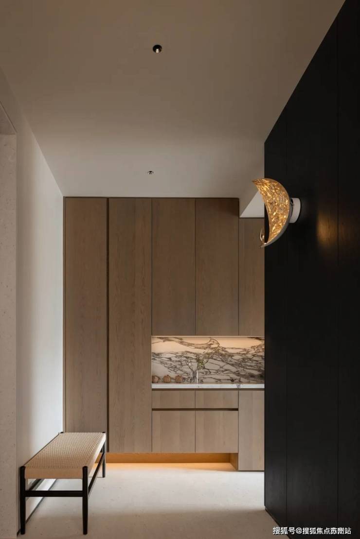 推开家门,一面深邃的黑木墙映入眼帘,如同一幅静谧的画布,仅以两盏独特的装饰灯点缀,仿佛预示归途的灯塔。