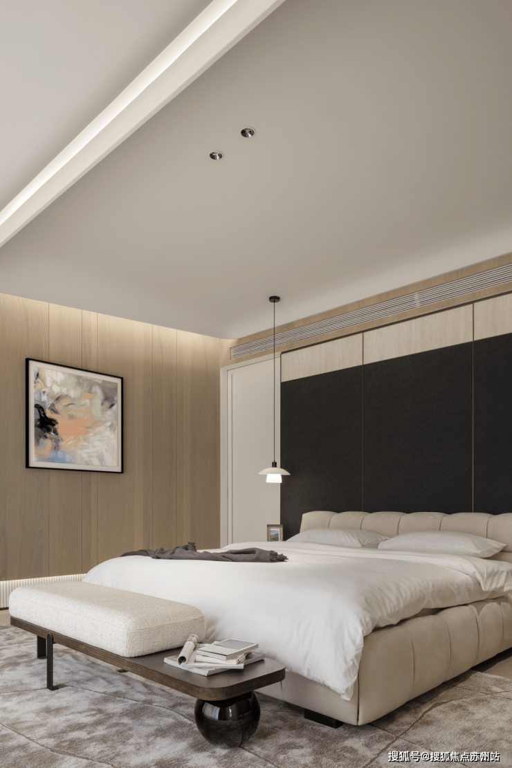 坡形顶的设计不仅提高了空间的视觉高度,也增加了空间的层次感和个性化艺术美感。通过巧妙隐藏空调风口等设备,整体空间变得简约干净。