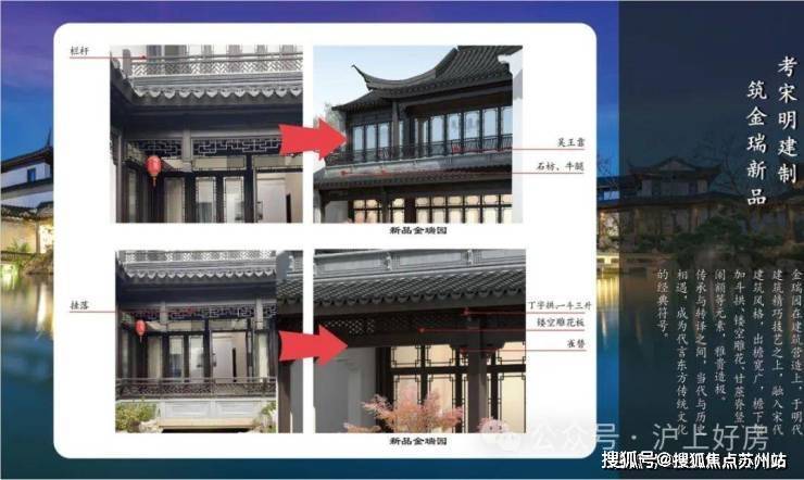 同时,建筑采用宋代宫殿,建筑出檐宽广,檐下增加斗拱、镂空雕花、甘蔗脊、阑额等元素,约2/3宅园设置入户连廊,为全国之最,雅贵造极。