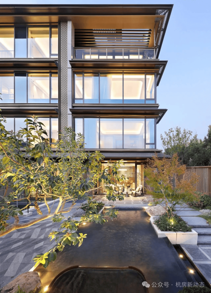 借势钱江直河公园,以“引水入园、借景成趣”两大设计手法,将直河的静美引入家园,与外部水景呼应,延续庐系的隐逸美学与现代东方手法。