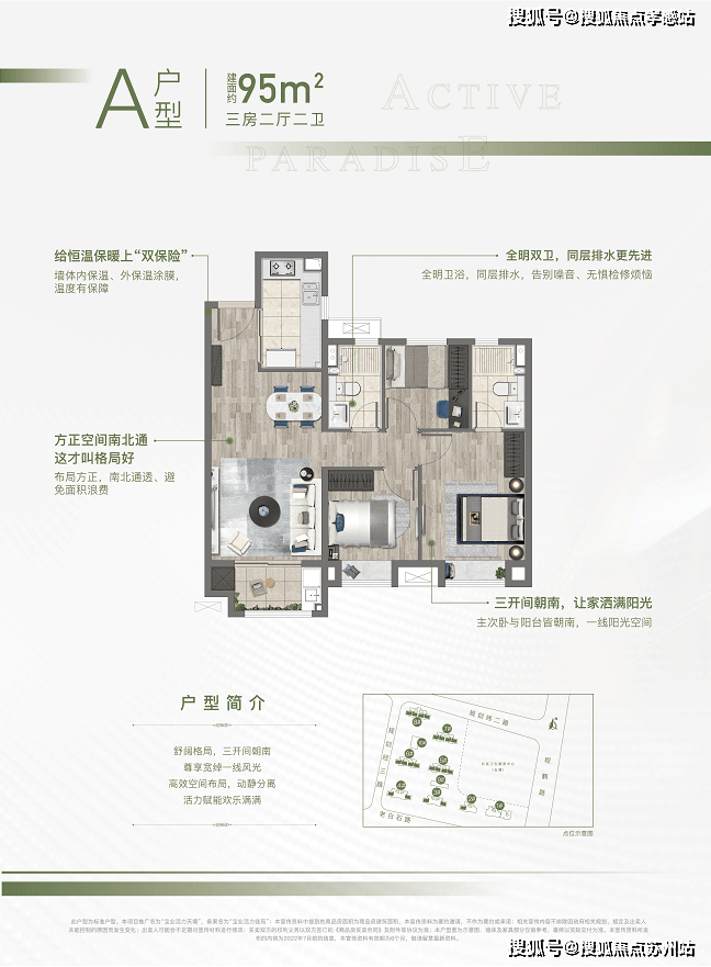 1、约95㎡的三房,南北通透,全明设计,三开间朝南,户型方正。