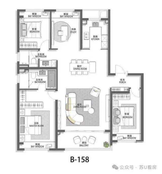 同样是5开间朝南,南向面宽拉升至约21m!甚至阔气到将两个次卫都放在了南面,3卫全明!