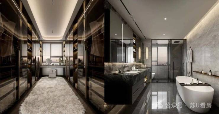 全屋采用大金中央空调、菲斯曼地暖壁挂炉,百朗新风系统国际一线 进口奢装高奢:厨电卫浴欧洲原装进口,卫浴(劳芬/当代);高颜值:客厅玛瑙岩板背景墙、弧形窄边吊顶;细节控:卫浴美妆冰箱、独立艺术浴缸;智配:人脸识别入户门锁、全屋WIFI覆盖等。