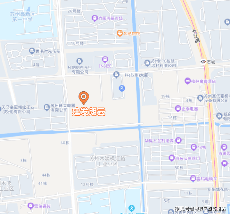 北面是商服用地,东面是苏州高新康复医院,北面是苏外幼儿园,南面则是河流,西面同样是厂区。