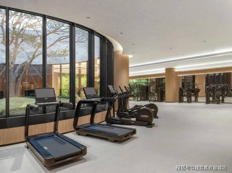 运动空间同样被自然环抱。下沉庭院植有一棵成年丛生铁冬青,让庭院风景随季节流转,永葆新鲜与诗意。负一层的景观有氧训练区,自然光倾斜入内,每一次训练都伴随鸟鸣自然之声。健身设备沿窗布局,让跑步训练如同在花园中进行。自由力量区与瑜伽舞蹈室延续了这一理念,运动者在此可感受树影摇曳、聆听鸟鸣,将日常锻炼升华为与自然对话的身心仪式。会所还配备三间普拉提室,让身体的每一寸伸展律动,都与自然的呼吸同频。