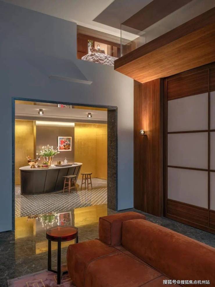 在“木屋”后方,是一个墙面和天花板都覆盖金箔的“水吧”。在这里,我们重新引入了一些当代西方设计语言——大理石地面图案、蛋形吧台和墙面护板细节。这些元素与醒目的红色高光烤漆柜相互平衡。