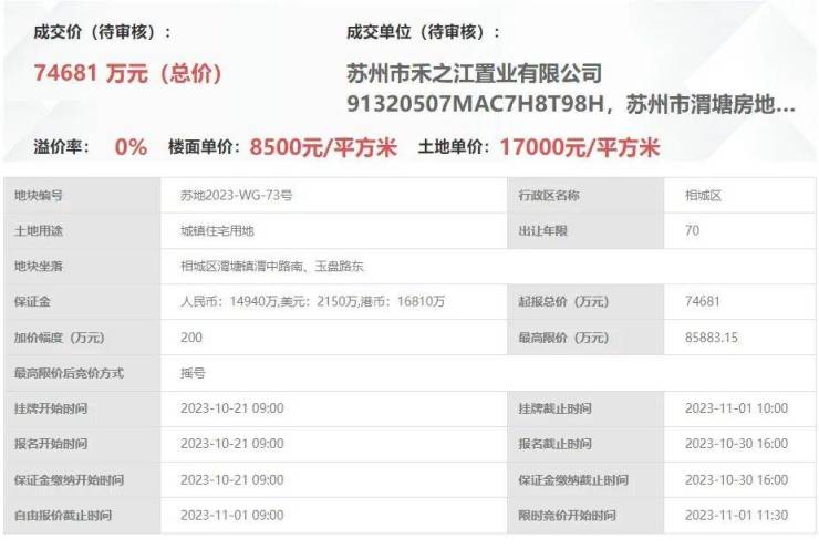 渭塘73号地块项目,即,苏地2023-WG-73号地块,位于相城区渭塘镇渭中路南、玉盘路东,是2023年11月1日,禾之江置业&渭塘房地产74681 以底价74440万元竞得,成交楼面价8500元/平。