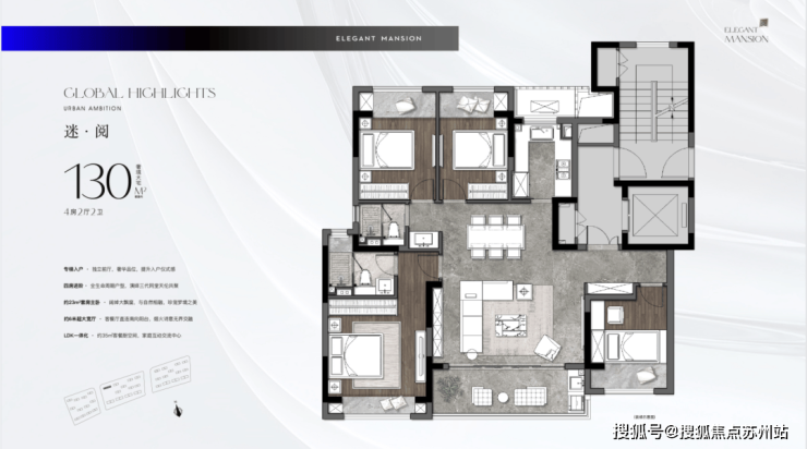 130㎡的户型是正四房设计,南北通透,大横厅设计,独立电梯私密入户,非常适合小家庭或者刚改家庭居住。