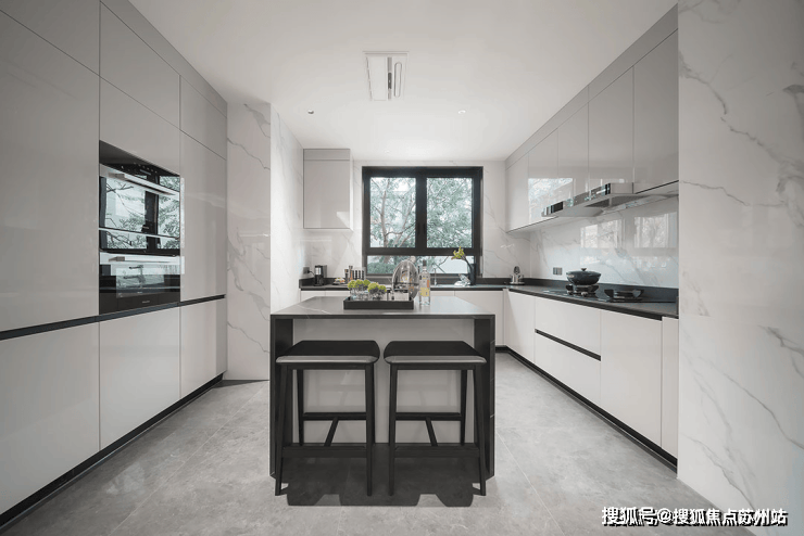 约7.7M超宽客厅及南向瞰景阳台,这个南向采光面的尺度感堪比别墅;另外,客餐厅+厨房一线相连,非常标准南北通透,