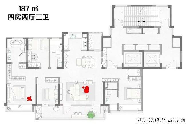 该户型同样为四房两厅三卫,建面约240㎡户型的缩小版。