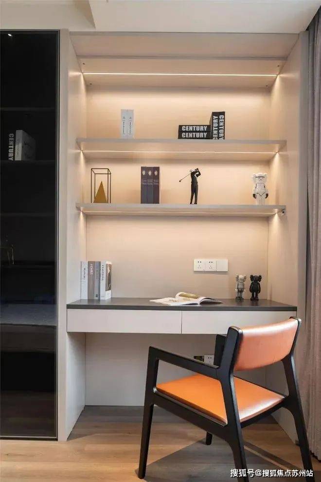 步入书房,一整面的定制柜体,封闭柜+开放格的展示,满足业主的储物需求,空间无主灯设计强调空间的纯粹,去除无谓的装饰,情调满满。