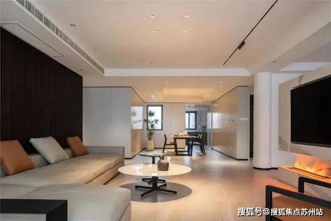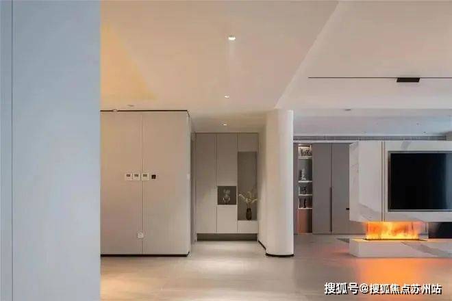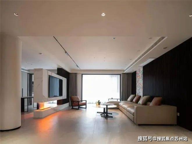 原始客厅面积较大,结合业主需求,为了防止空间的簇拥感,设计师用悬空式电视背景墙结合真火壁炉充当隔断,把客厅一分为二,一边是客厅,一边是书房。