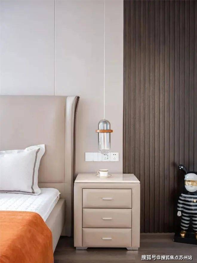床头用不同材质拼接,打破了整个空间的沉闷感,浅棕色的床头柜造型别致。