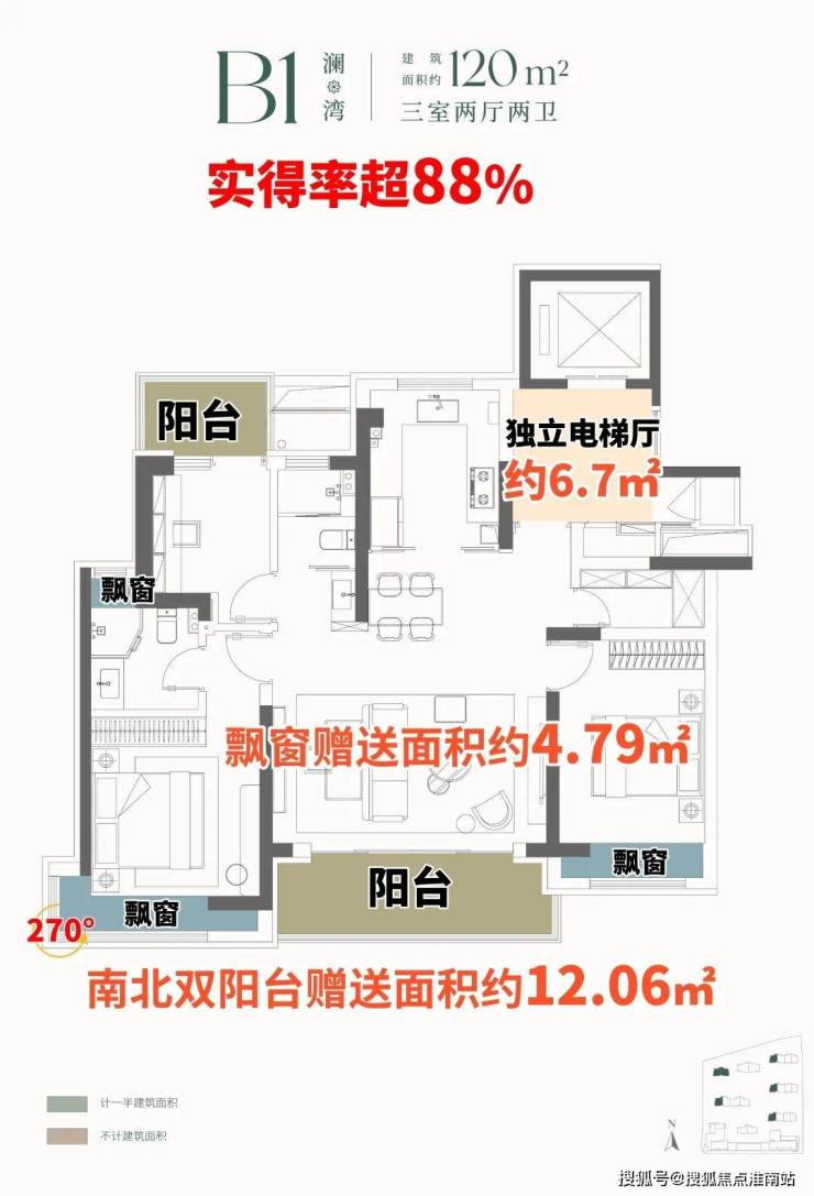 建面120㎡B1户型,约12㎡南北双阳台空间,阳台“买1赠1”,赠送约6㎡,次卧拓展后都有舒适尺度,更附赠约4.79㎡飘窗,实得率超88%。