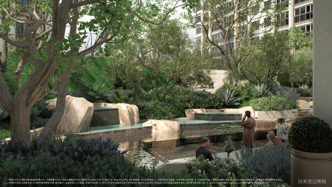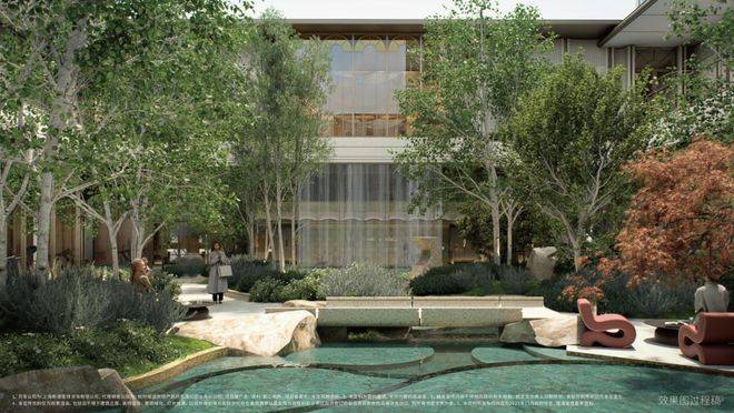 "一心两轴三花园" 的景观布局,绿植错落、水景灵动,步道蜿蜒其间,仿佛置身半岛艺奢藏馆。