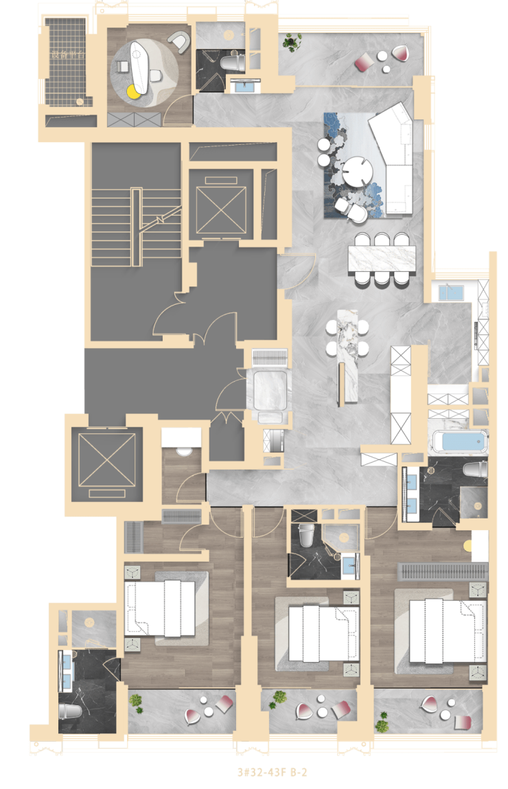项目中心坐落的中央景观规模约3000㎡,周边环绕着四座建筑,其中三幢为超高层设计,整体布局高低兼顾,启承有序,开阖有度,塑造城市云端生活新方式。