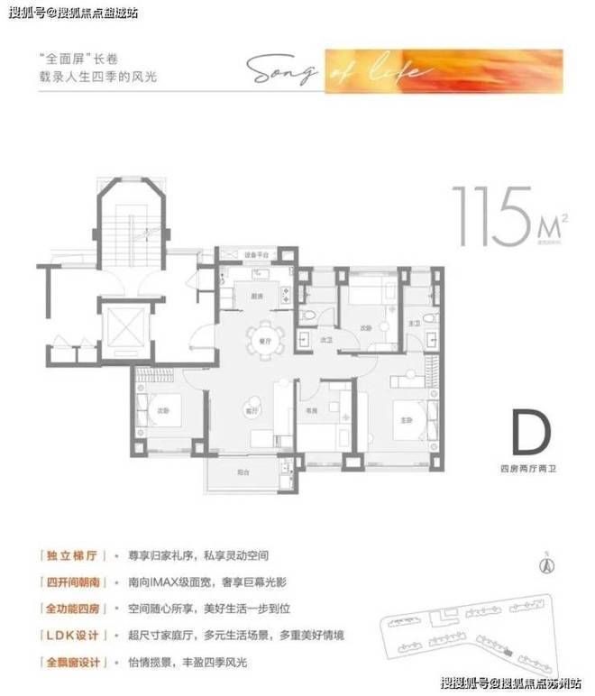 建面约115㎡4房2卫户型做到了同面积段罕见的四开间朝南+四房设计,南向IMAX级景观面,卧室阳光满溢,功能性也拉满。功能性十足的同时也不失舒适性,主卧南向大面宽+贯穿南北。