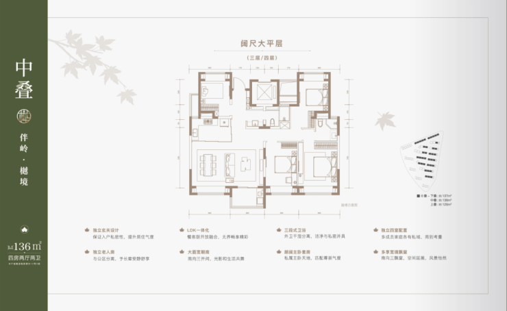 建面约137㎡下叠,四房两厅三卫全能格局,非常适合二娃家庭以及三代同堂.