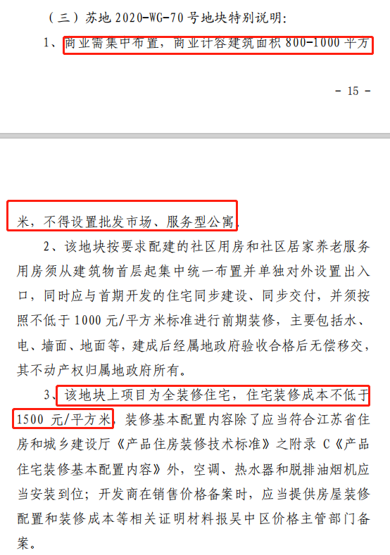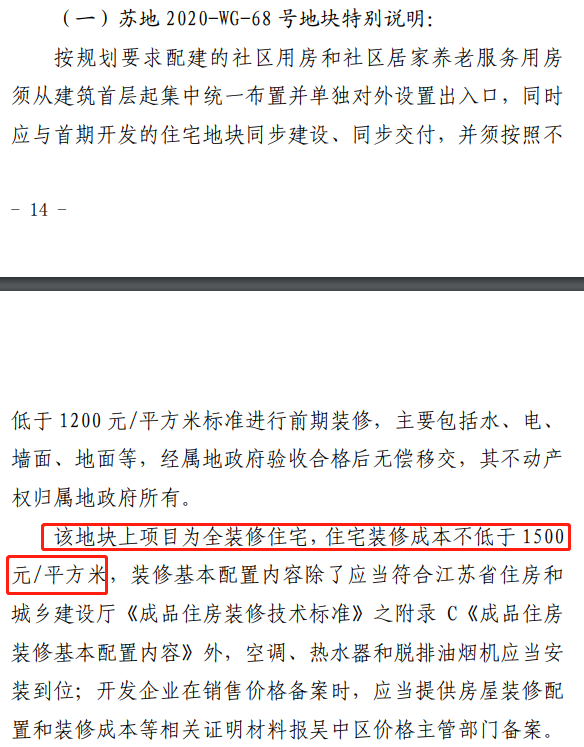 地块要求全装修住宅,装修成本不低于1500元/平;