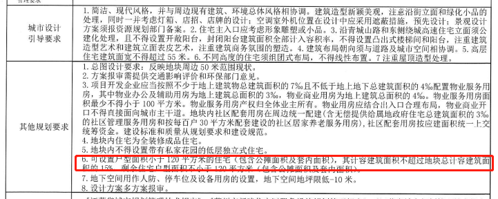 小于120平的住宅不超于15%;剩余要求不小于120平;