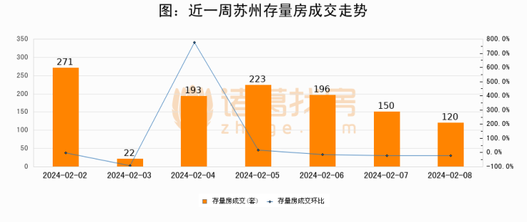 从存量房来看,2024年02月08日苏州存量房单日成交120套,比昨日减少30套,环比下降20%。从近一周存量房成交来看,苏州存量房日均成交套数为167套,02月08日单日成交120套,低于近一周平均水平28.1%。