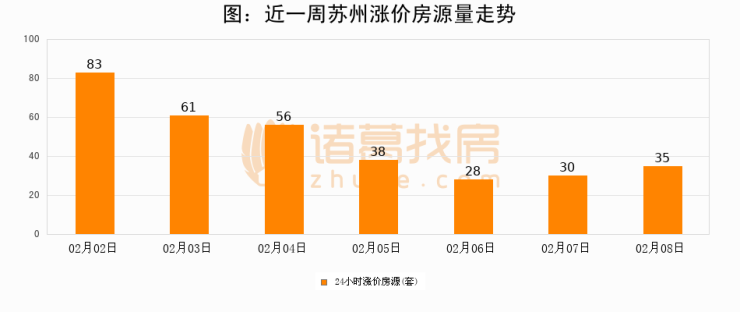 根据诸葛找房数据显示,苏州24小时涨价房源量为35套,较02月07日增加5套,环比上涨16.7%。与此同时,涨价房源占比小幅扩大,业主信心有所提升。