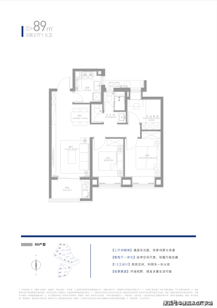 约89㎡三房两厅一卫:1.5卫设计为临港首创,南北通透,主卧套房设计,独立玄关与U型厨房提升实用性。