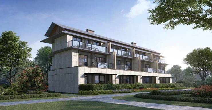 新亚洲建筑风格。选用米灰色为主基调,让建筑与周边墅区环境融为一体,甄选石材、金属、玻璃等优质选材,将自然元素融入建筑之中,让建筑回归自然本真,来达到一种人、建筑、自然的和谐共生。