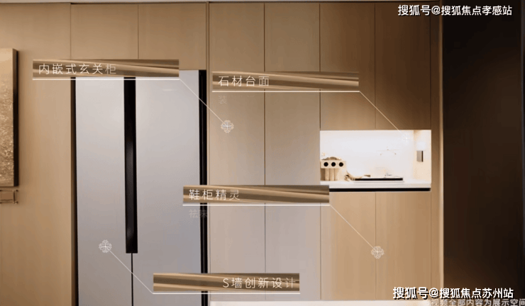 入户后,第一眼就可以看到玄关柜采用石材台面,下至标配鞋柜精灵,在S墙创新设计后,首批次房源更是额外赠送西门子双开门冰箱,这在以往可是上海千万级新房的交付标准: