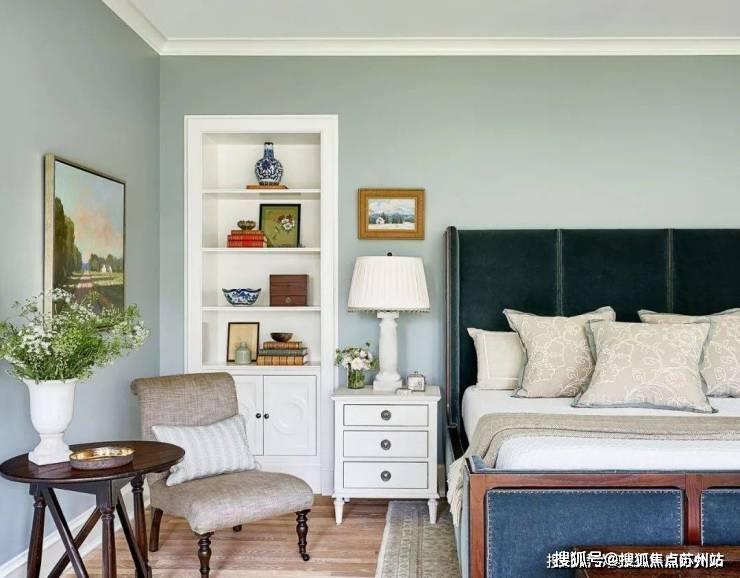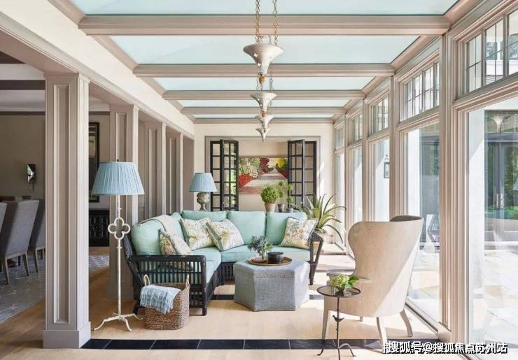 从客厅开始,整个空间都遍布着蓝色的元素,设计师以星座为主题进行设计,搭配上JamesThomas的茶几、HollyHunt的沙发、Minotti的扶手椅和AndriannaShamaris的边桌,打造既高级又充满梦幻感的居家空间。