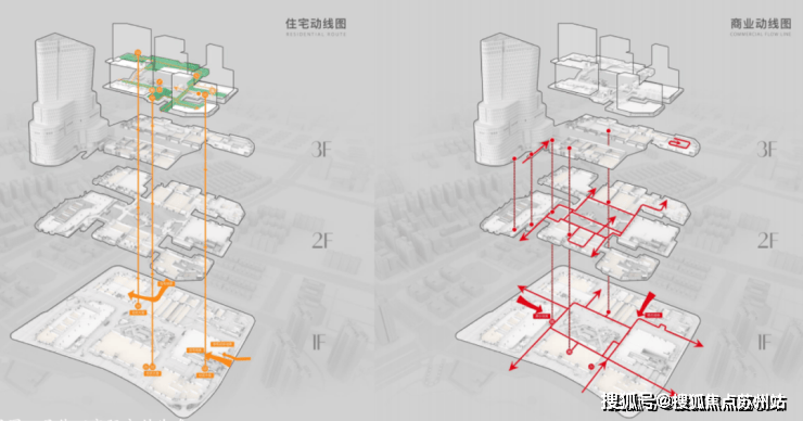 业主可通过独立的动线,由内部的高线公园到达商业街区,与外部进入的城市人群动线分隔,保证了便捷与隐私。