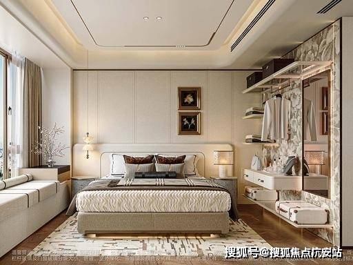 主卧“全景休憩舱”配置更是惊艳:边套专属270°环景飘窗采用大尺寸玻璃,视野通透无遮挡,空间感与采光面大幅提升;放完标准双人床+双床头柜后,还能打造独立衣帽间,满足衣物、配饰收纳需求;主卫全明设计,采用经典三段式布局,双面巨幕玻璃带来双面采光瞰景体验,高端洁具五金搭配奢石台面,奢华感拉满.