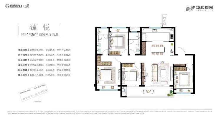 【臻悦 建面约143m² 四房两厅两卫】 格局更加阔绰,同样是四开间朝南。客餐厅一体化设计,连接超大阳台,整个公共区域非常气派。双套房设计,兼顾了主人隐私和长辈的居住便利,是真正为多代同堂家庭考虑的改善户型。