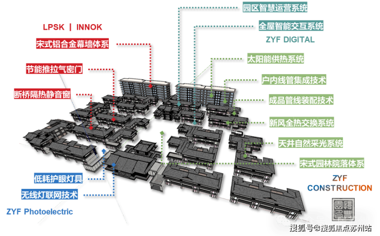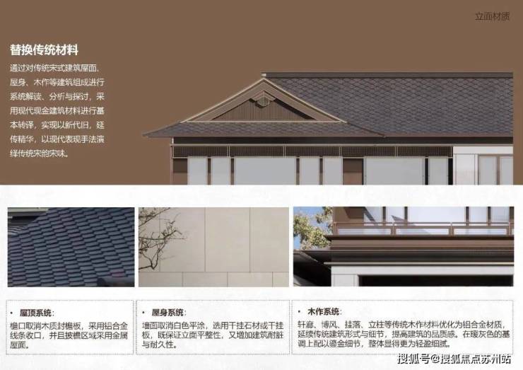 在地文化方面,忆丰园结合苏州当地文化特色,以中国传统营造技艺打造中轴对称布局,致敬东方人居。项目大手笔打造宋式园林,开创礼序井然的诗意之境。在建筑材质选择上严格把关,屋顶系统采用铝合金线条替代木质封檐板,增强结构稳定性和耐久性;屋身系统使用干挂石材或板材,保持建筑立面平整美观,提升抗污性和使用寿命。