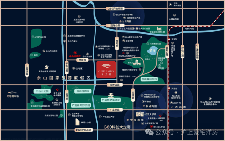甘云间择址松江佘山国家级旅游度假区核心,坐拥上海唯一自然山林胜地的稀缺基因。这里是长三角塔尖人群的传统聚居地,自上世纪90年代起便汇聚多座亿级别墅,形成不可替代的隐贵圈层氛围,土地稀缺性早已刻入基因。