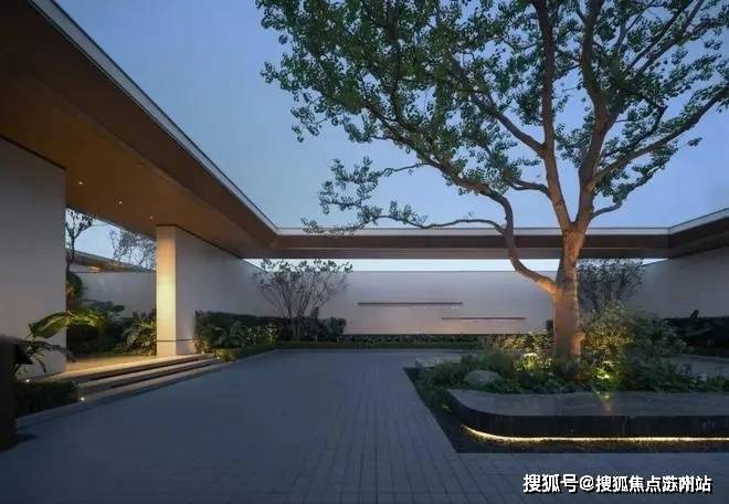 ➤ 落客庭院,进入迎宾门廊便是落客庭院,定制的整石雕刻而成的石台上镶嵌着金色的项目logo,特选的从生乌桕赫然挺立,在静静等候业主的到来;