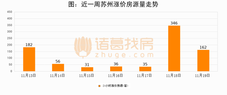 根据诸葛找房数据显示,苏州24小时涨价房源量为162套,较11月18日减少184套,环比下降53.2%。与此同时,涨价房源占比小幅回落,对于购房者来说是一个入市窗口期,购房者可抓住时机入市。