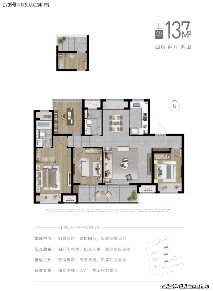 一园林:洋房设置光影花园,北入户花园归家,前厅设置私属花园,从花园两侧入户,增加归家仪式感和温馨感