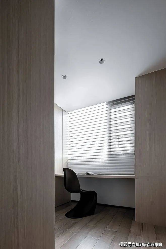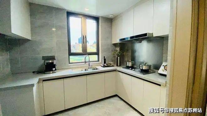 餐厨空间也采用同样的设计手法,增加内嵌式储物空间,让开放式厨房进一步宽敞,许多物品也有了摆放的空间。落地窗提高用餐愉悦感。