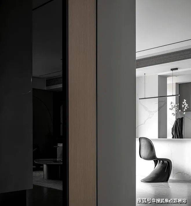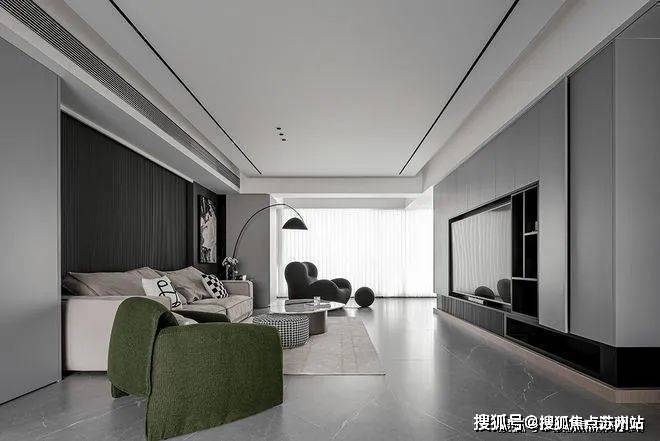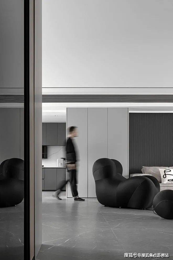 空间布局重新打造,传统设计的隔断被拆除,通透感中,各区域联系更紧密。黑色沙发奇特的造型带来动感和时尚元素,沙发上有凸起设计,提高支撑感,让居者小憩时更加舒适,体会时光温柔。