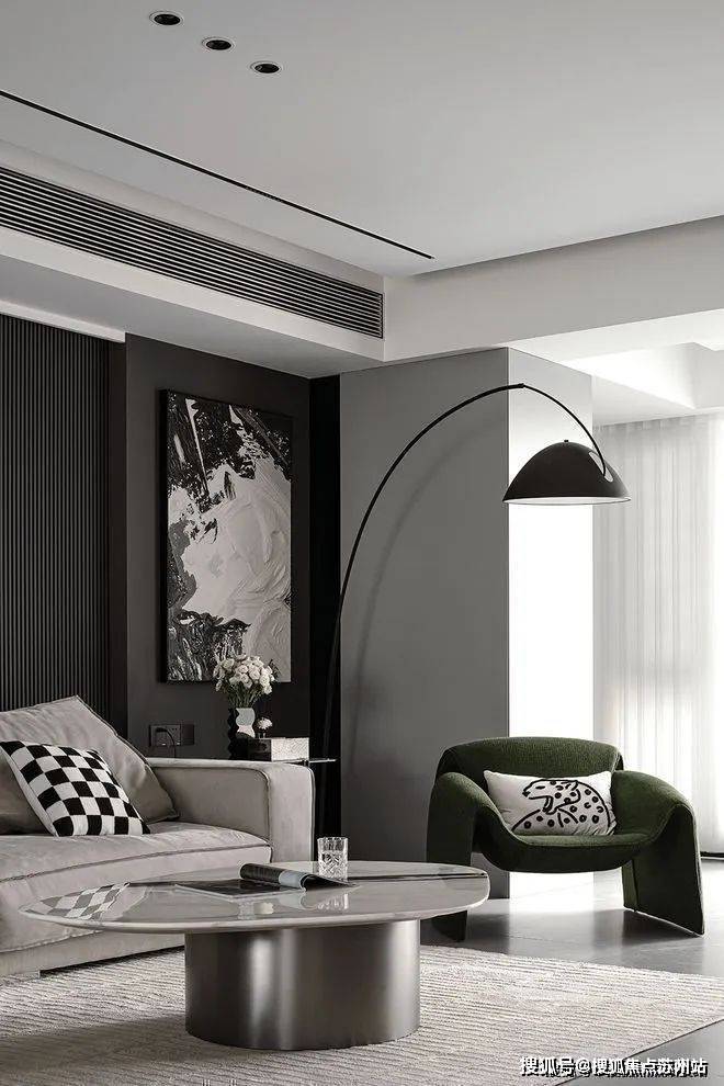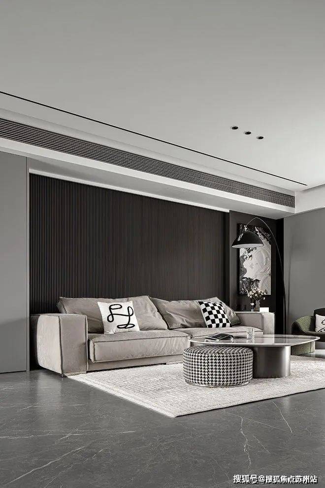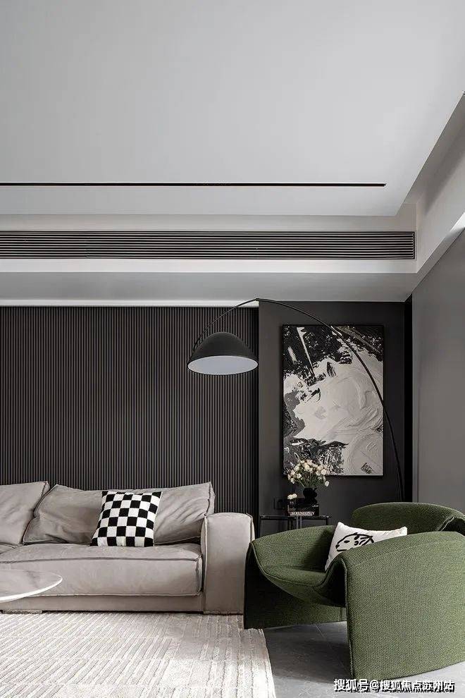 客厅吊顶采用双层设计,为空间带来层次美感。沙发墙面使用灰色软包材料装饰,金属线条进行点缀,优雅不失高级感。