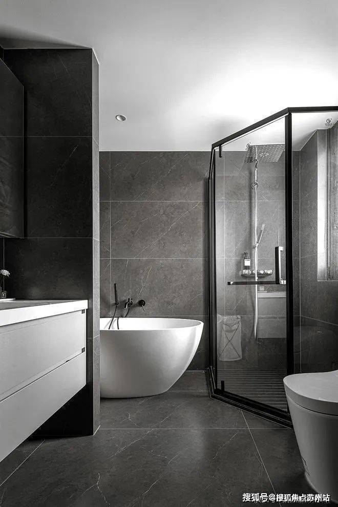 浴室黑白搭配效果出色,背景部分使用黑色,陶瓷的白色提高质感,形成美学反差效果。