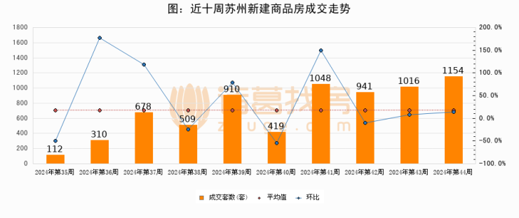 进入2024年第44周(10月28日-11月03日),苏州新建商品房成交1154套,较上周增加138套,环比上涨13.6%。从近十周成交来看,周均成交套数为709套,本周成交1154套,高于近十周平均成交量62.8%。