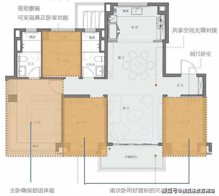 飘窗带来当然有使用面积上的高额赠送,但还有人视点上的空间外拓。这直接让户型在实际感受上能和更大面积段户型持平。