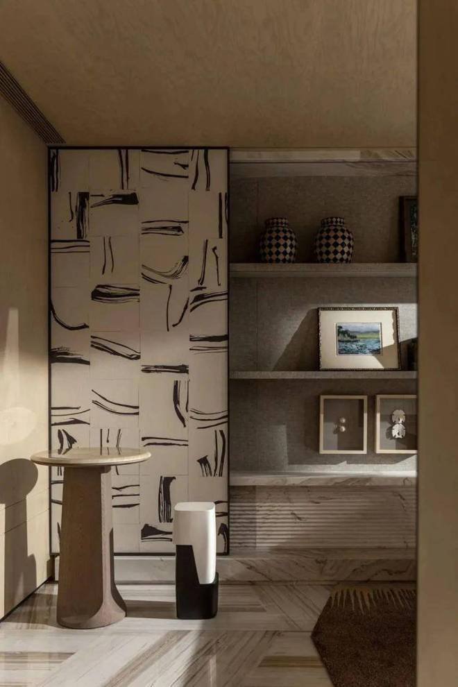 于是,设计师以“复古简约”风格铺陈全屋,就像王家卫电影里穿旗袍用智能手机的角色,矛盾产生故事性。