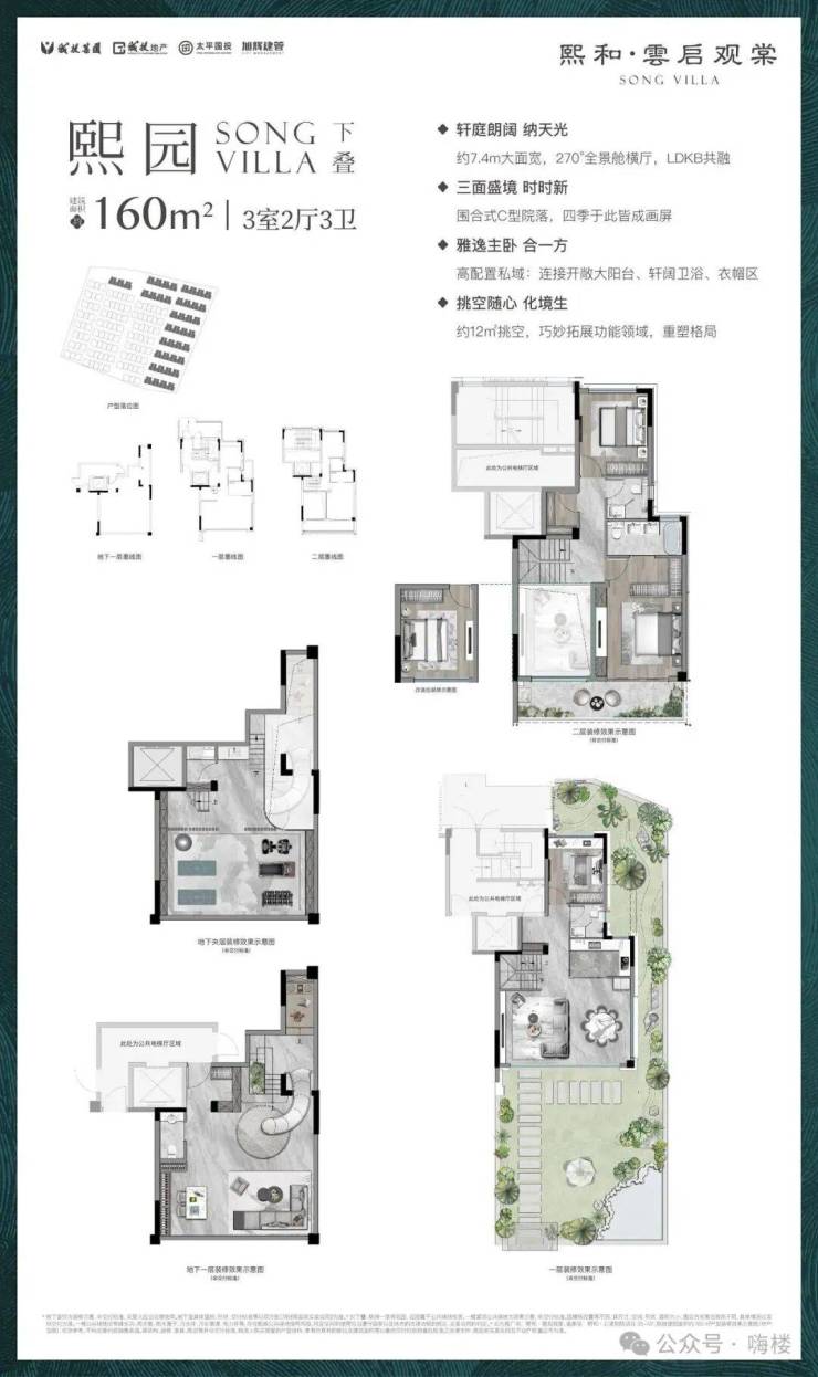 下叠(160㎡):可做4房3卫,面宽7.4米,赠送客厅挑高、围合式C型院落和地下空间。