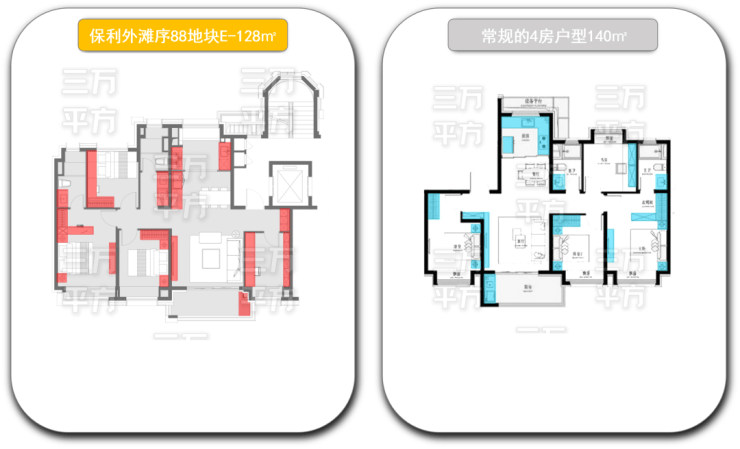 洋房产品,惊人地毯率、超低公摊,优秀阳台和飘窗设计,充足的储物空间等等这些优秀的特点,本户型同样具备!本户型可以PK常规140㎡面积段户型。我们还是来看数据。