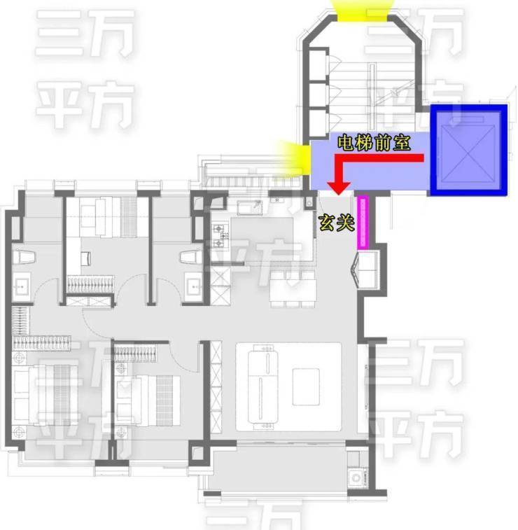 另外一个特别让人感到舒服的地方是电梯轿厢的开门没有和单元里两户的户门直接对视,而是形成一个90度的转角,这样增加了对于隐私的保护。