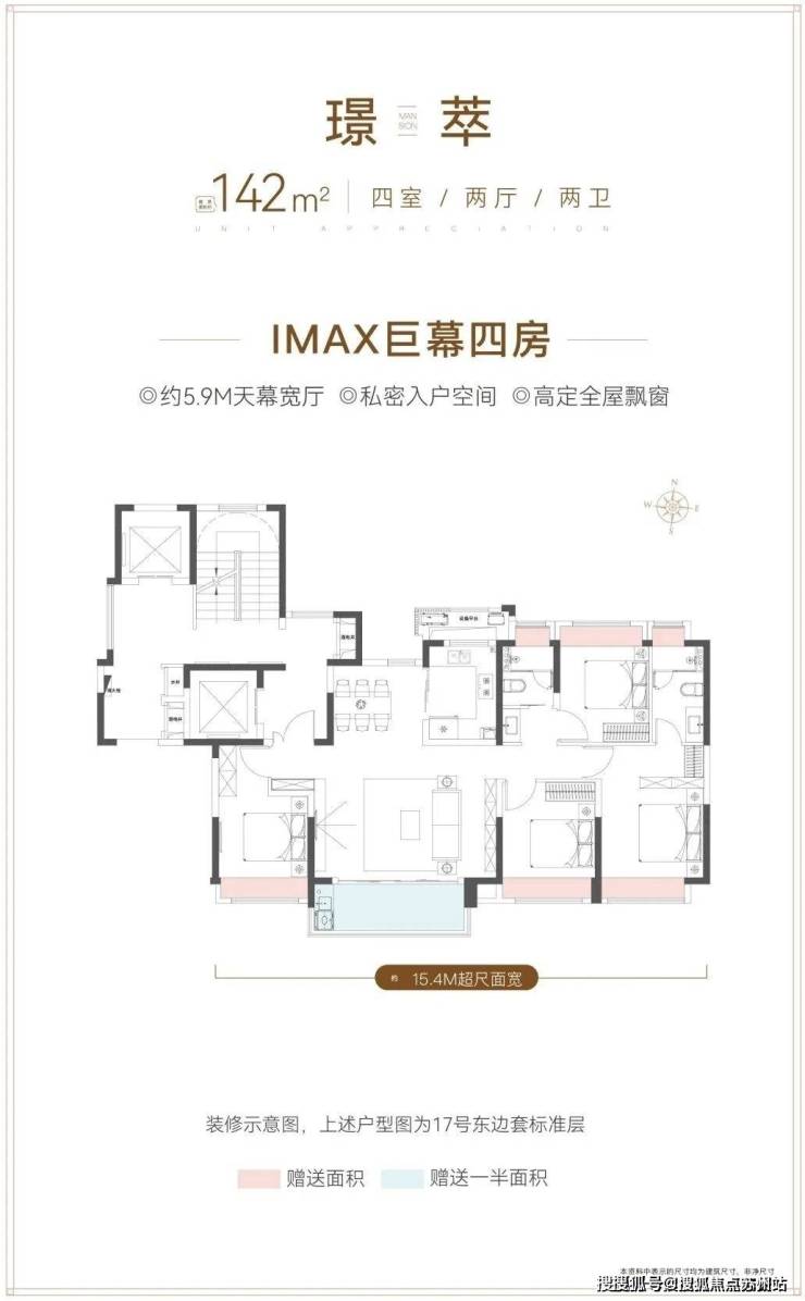 倘若拥有更高的预算,那么这套建面约142㎡4房2厅2卫非常适合改善家庭的需求。其南向面宽达到了15.4米,比肩豪宅平层产品的气场和尺度感。
