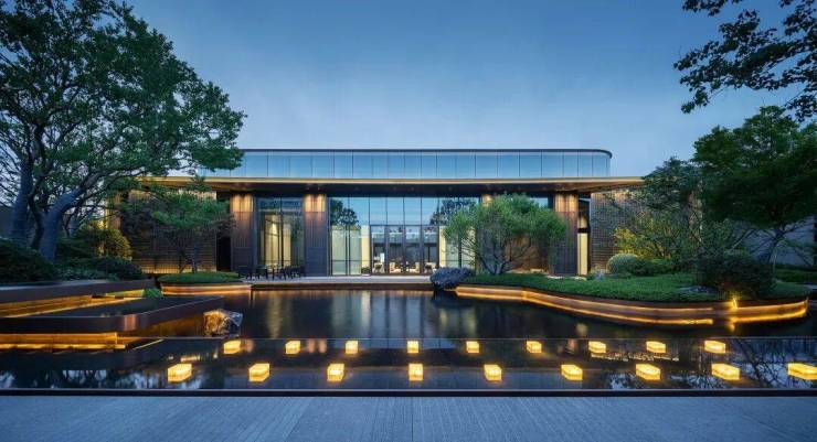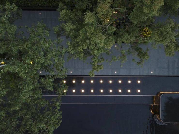 城市的喧嚣在这一隅园林中被沉淀,天色低垂,一池澄澈水面映衬着水乡的灯火通明,设计将夜幕中的灯火点缀在景池中,如江南繁华初绽,繁星摇曳。